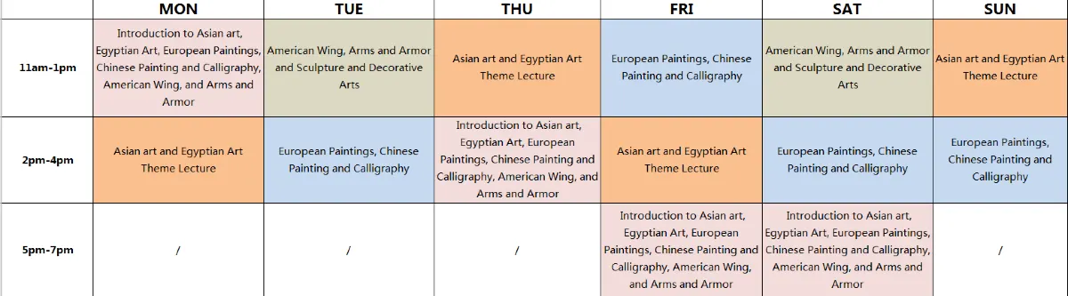 Today we will visit the six essence pavilions of the Metropolitan Museum of Art. Our excellent Chinese tour guide will accompany us to explain the The Met's collection of Asian art, Egyptian Art, European Paintings, Chinese Painting and Calligraphy, American Wing and Arms and Armor.